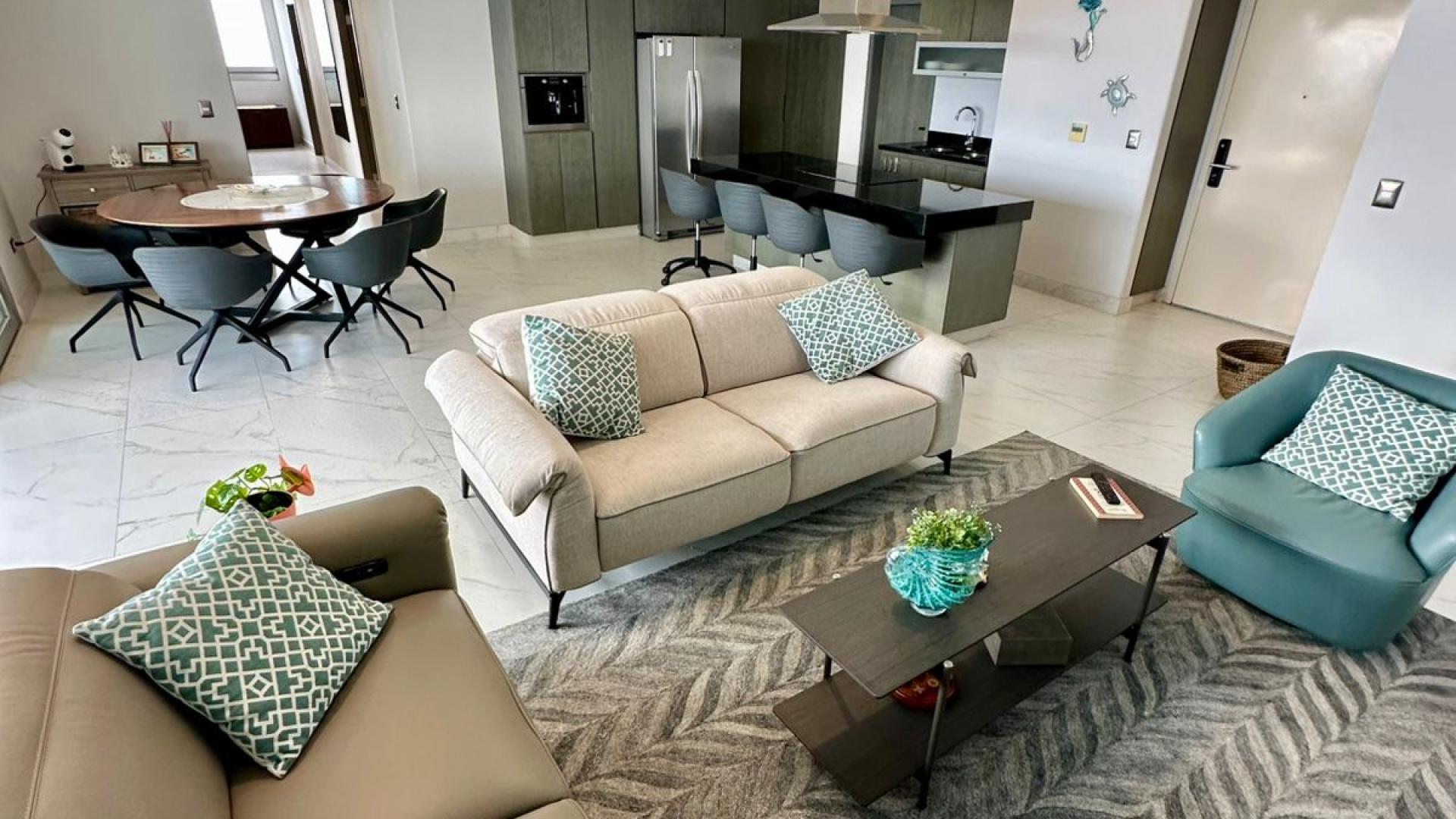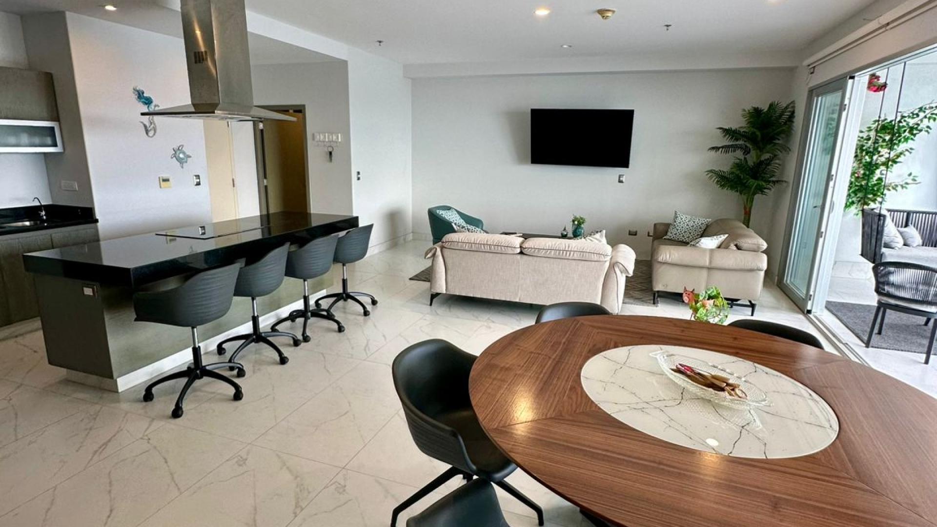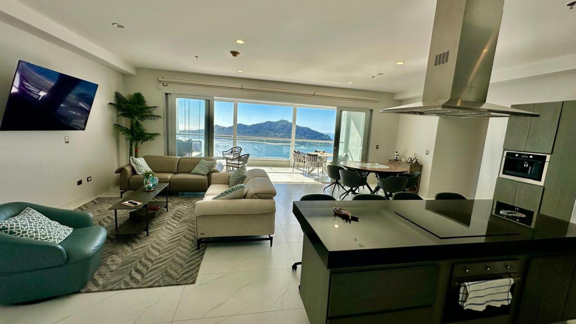 El condominio consta de enorme área de sala y comedor, con hermosa cocina con cubierta de granito y gabinetes de cedro, totalmente equipada, una inigualable terraza con espectacular vista al Océano Pacifico, un medio baño para visitas y cuarto de lavado, también consta de 3 amplias recamaras cada una con su baño y closet, la master consta con walk in closet y con doble ventana con vista al mar.